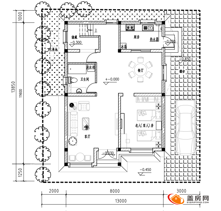 南向开门,入户后既是一个客厅,虽然户型不大,但客厅的设计还是较为宽敞的。往里走是一个独立的餐厅,紧邻厨房,取餐用餐都很方便,厨房内设有后门可直通户外。在一层的南向我们设计了一间老人房,方便老人的日常起居。