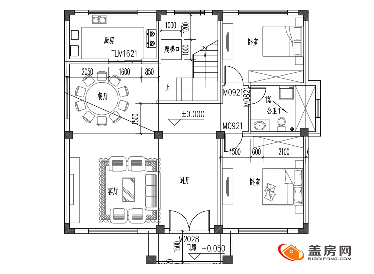 一层客厅面积很大,并且与餐厅互借空间,显得格外的敞亮。厨房与餐厅相邻,取餐用餐都很方便。东侧有两间卧室,南北向各一间,南向大卧室可做老人房,北向次卧做客房或佣人间。平面图我们可以看到楼梯附近有个爬梯口,下面是一个小地下室,做储藏间。