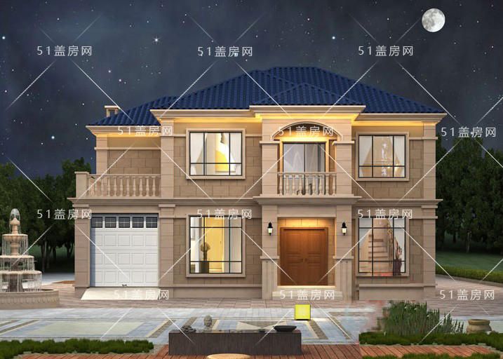 这款农村自建房外观效果十分出色。房子采用了经典的欧式建筑风格,结合了现代的设计元素。深蓝色的屋顶与浅黄色的墙面形成了鲜明的对比,使整个房子看起来既高贵又温馨。宽大的窗户确保了室内充满了自然光,同时也为居住者提供了宽阔的视野。夜晚时分,房子被温暖的灯光照亮,与星空和月亮相映成趣,给人一种宁静、舒适的感觉。总的来说,这栋房子不仅美观大方,而且充满了家的温暖和舒适感。