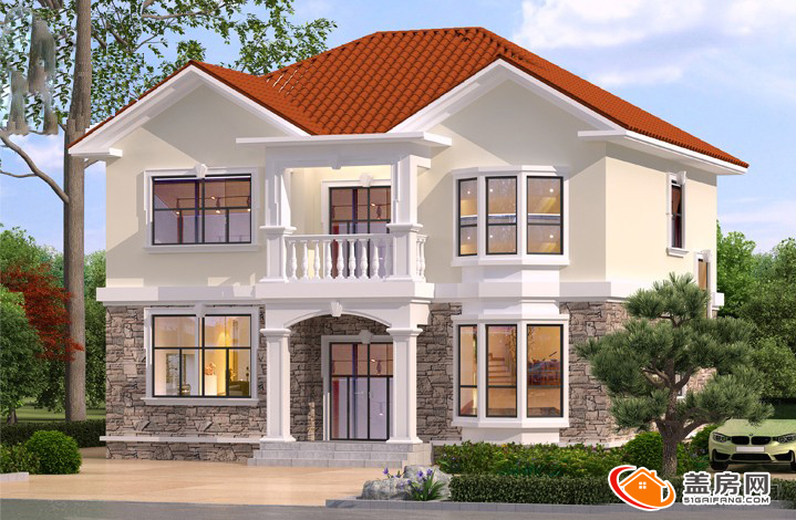 这是一栋两层的自建房,外观采用了经典的欧式设计。房子的屋顶是红色的瓦片,与浅黄色的墙面形成鲜明对比。一楼和二楼都有多扇大窗户,窗户边缘装饰有白色线条,增添了几分精致感。正门两侧是灰色的石材装饰,与整体的色彩搭配相得益彰。门前有一个小阳台,阳台上放一些植物,为房子增添了生机。整体来看,这栋房子给人一种温馨、舒适的感觉。
